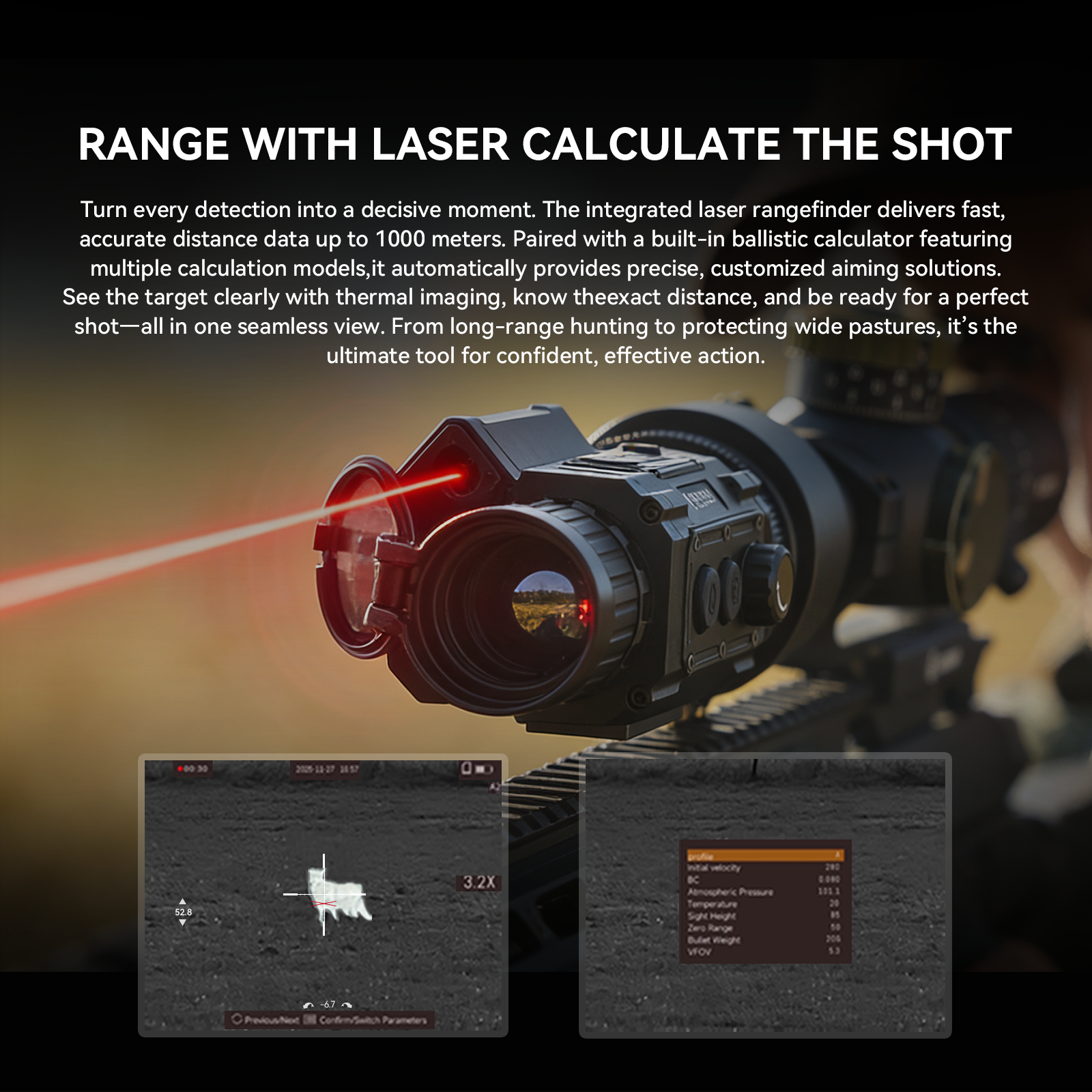 - All-in-One Tactical Thermal Imaging Scope: The integrated 1000m laser rangefinder, ballistic calculator, and gyroscope transform this thermal riflescope into a comprehensive tactical system, providing real-time distance, tilt angle, and trajectory data for precision in dynamic situations.